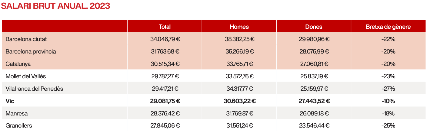 Comparant el salari mitjà amb altres ciutats mitjanes, el salari a Vic se situa per sota del de Mollet del Vallès i Vilafranca del Penedès, però per damunt del de Granollers i Manresa. Destaca Vic com al municipi amb la bretxa de gènere més baixa; les dones tenen un salari un -10% inferior als homes.